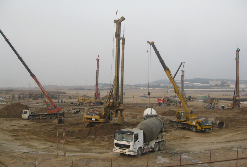 海南LNG項(xiàng)目位于海南省洋浦經(jīng)濟(jì)開(kāi)發(fā)區(qū)內(nèi)洋浦灣黑巖港附近,廠區(qū)東側(cè)為海南金海漿紙廠,北側(cè)為海南石化廠30萬(wàn)噸原油碼頭。儲(chǔ)罐區(qū)采用鉆孔灌注樁對(duì)地基進(jìn)行處理。我公司承擔(dān)了2個(gè)儲(chǔ)罐的樁基施工和短柱施工,工作內(nèi)容為1#罐、2#罐所有856根工程樁、樁周土方開(kāi)挖、鑿樁頭、柱子施工、土方回填施工。