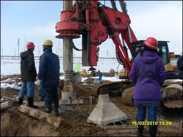 本工程施工工期緊,工序多,且施工經(jīng)歷冬雨季,因此,施工過程中合理的安排各工序施工順序,采用了完善的冬雨季施工方案。在基礎(chǔ)樁施工過程中,解決了地表13m范圍內(nèi)松散回填地層(夾雜卵石、大塊漂石)引起的嚴重漏漿、塌孔問題,保證了工程順利開展。