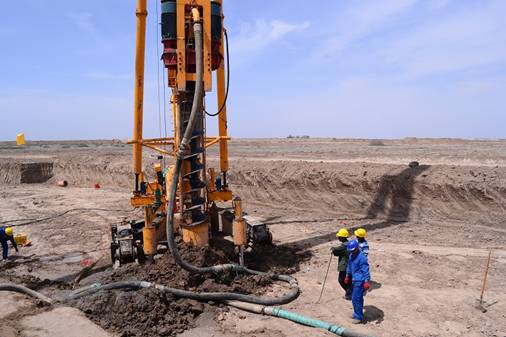 本期工程地處石河子市121團(tuán)團(tuán)部東北約1公里處。該場地東西長351米,南北寬約220米。廠址地勢平坦開闊。我單位主要承擔(dān)該工程地基處理施工任務(wù),主要包括: 主廠房、冷卻塔、煙囪等部位的降水工程、CFG樁、土方開挖、樁頭破除、褥墊層施工及戈壁料換填任務(wù)。公司共完成42929.27m3土方開挖,直徑400mm的CFG樁2868根,約4754.87m³混凝土,6306.71 m3戈壁料換填墊層施工以及全場區(qū)的降水工程。
