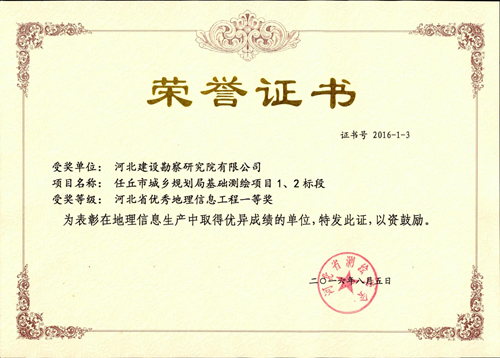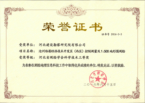 8月5日,我公司承擔的任丘市城鄉(xiāng)規(guī)劃局基礎測繪項目1、2標段被河北省測繪學會評為河北省優(yōu)秀地理信息工程一等獎;8月15日,我公司承擔的滄州臨港經濟技術開發(fā)區(qū)(西區(qū))控制測量及1∶500地形圖測繪項目被河北省測繪學會評為河北省測繪學會科學技術三等獎。