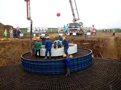 我公司承擔了該風電場的土建工程及接地,施工內(nèi)容主要包括風電機組基礎(chǔ)33座、變壓器基礎(chǔ)33座,共完成土石方開挖與回填40112m3,完成混凝土12578m³。