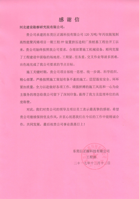 我公司承建的東莞巨正源科技有限公司120萬噸/年丙烷脫氫制高性能聚丙烯項(xiàng)目一期工程—PP裝置擠壓造粒廠房、PDH裝置反應(yīng)框架鉆孔灌注樁基礎(chǔ)工程,克服了施工過程中褚多困難,按照合同節(jié)點(diǎn)圓滿完成施工任務(wù)。東莞巨正源科技有限公司近日發(fā)來感謝信,對公司領(lǐng)導(dǎo)及項(xiàng)目員工表示最真摯的感謝。