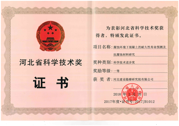 5月30日上午,河北省科學(xué)技術(shù)獎(jiǎng)勵(lì)暨慶祝“全國科技工作者日”大會在石家莊舉行。省委書記王東峰、省長許勤等省領(lǐng)導(dǎo)出席大會,并為榮獲2017年度河北省科學(xué)技術(shù)獎(jiǎng)勵(lì)代表和第十屆河北省優(yōu)秀科技工作者代表頒發(fā)證書。我公司《腐蝕環(huán)境下混凝土的耐久性壽命預(yù)測及抗腐蝕材料研究》獲省科技進(jìn)步一等獎(jiǎng)、《素混凝土剛性樁復(fù)合地基核心技術(shù)研究與工程應(yīng)用》獲三等獎(jiǎng),聶慶科總工程師代表公司參加了大會并上臺領(lǐng)獎(jiǎng)。這是我公司繼2014、2015年度后再獲河北省科技進(jìn)步一等獎(jiǎng),對我們既是極大鼓舞和肯定,也必將激勵(lì)和鞭策廣大專業(yè)技術(shù)人員,以黨的十九大精神和習(xí)總書記在兩院院士大會講話精神為指引,積極投身創(chuàng)新實(shí)踐,大力開展科研攻關(guān),為不斷推進(jìn)巖土工程技術(shù)發(fā)展、提升企業(yè)創(chuàng)新能力和核心競爭力而繼續(xù)努力奮斗。