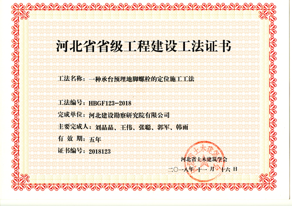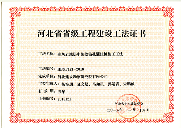 近日,河北省土木建筑學會組織專家對建筑施工企業(yè)申報工法進行了評審,我公司申報的礁灰?guī)r地層中旋挖鉆孔灌注樁施工工法、鉆孔灌注樁泥漿凈化處理施工工法、一種承臺預埋地腳螺栓的定位施工工法,被評為2018年度省級工程建設工法。