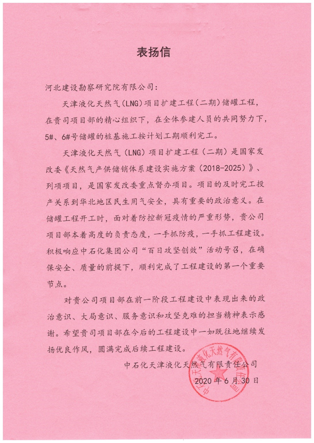 公司承建的天津液化天然氣(LNG)項目擴建工程(二期)5#6#罐樁基工程,自2020年4月5日正式開工,歷經83個日夜的奮戰(zhàn),最終于2020年6月26日優(yōu)質、高效、圓滿的完成了5#6#罐的樁基施工任務。中石化天津液化天然氣有限責任公司,對我公司中石化天津LNG二期項目部提出表揚,表揚我公司領導及全體項目施工人員對項目高度負責的態(tài)度,一手抓防疫,一手抓工程建設,積極響應中石化集團公司“百日攻堅創(chuàng)效”活動號召,在確保安全、質量的前提下,順利完成了工程建設的第一個重要節(jié)點。同時對我公司在前一階段工程建設中表現(xiàn)出來的政治意識、大局意識、服務意識和攻堅克難的擔當精神表示感謝。希望我公司在今后的工程建設中一如既往地繼續(xù)發(fā)揚優(yōu)良作風,圓滿完成后續(xù)工程建設。