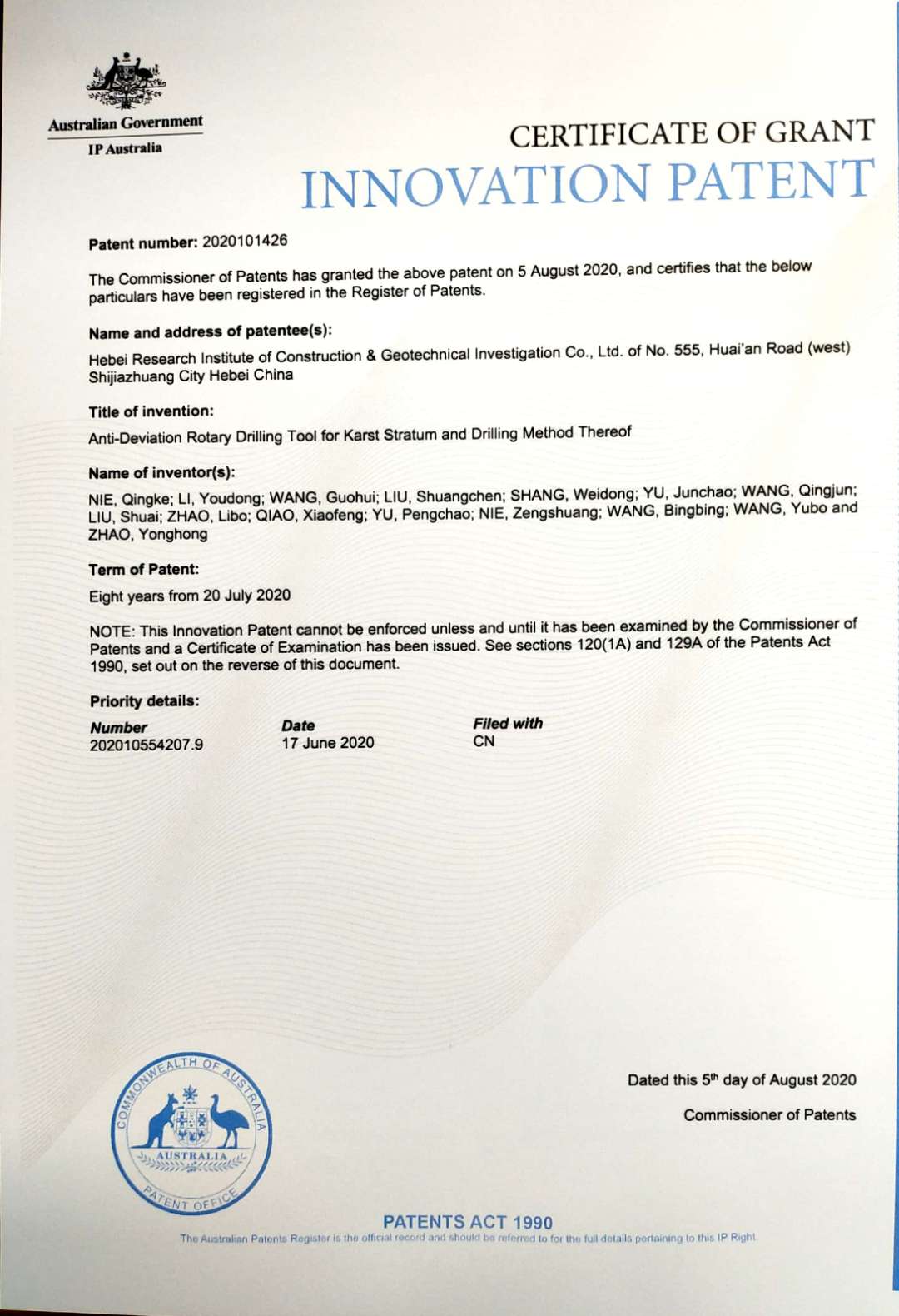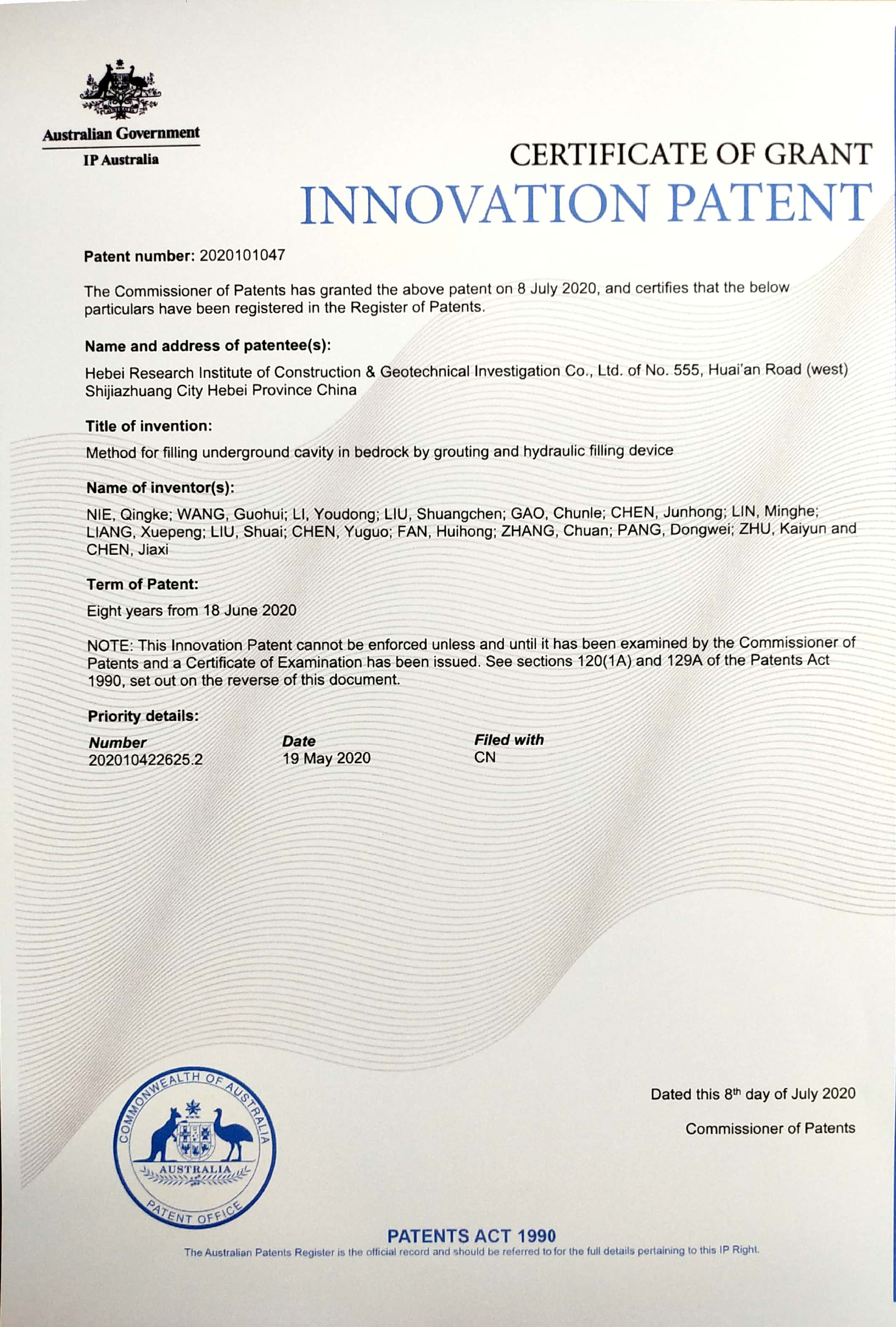 近日,由我公司開發(fā)完成的兩項(xiàng)新技術(shù):“一種填料注漿充填基巖地下空洞的方法以及一種水力充填裝置”、“一種巖溶底層旋挖鉆孔防斜鉆具及鉆孔方法”,被授予澳大利亞專利權(quán)。這是公司第一次申請(qǐng)國際專利,申請(qǐng)成功提升了公司無形資產(chǎn)價(jià)值與品牌價(jià)值,體現(xiàn)了我公司較強(qiáng)的技術(shù)創(chuàng)新能力及企業(yè)綜合實(shí)力。