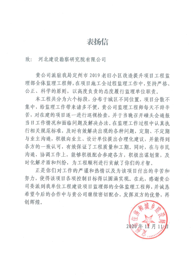 2020年12月我公司收到來自定州市住房和城鄉(xiāng)建設局關于定州市2019老舊小區(qū)改造提升項目監(jiān)理工程的表揚信,目前該項目已順利竣工驗收。雖然該項目要求時間緊、任務重,但在監(jiān)理過程中我們公司嚴格按照相關規(guī)范、標準,科學管理,嚴謹認真負責的工作作風,保證了該項目按期完工,給各方留下了深刻的印象,不僅得到了定州市住房和城鄉(xiāng)建設局的高度認可和贊譽,還贏得了周邊市民的一致好評,樹立了良好的口碑和信譽,為躋身定州建筑市場更好擴展業(yè)務奠定了基礎。
