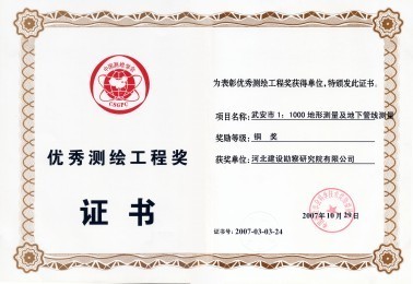 由工程測量公司完成的《武安市1:1000地形測量及地下管線測量》工程獲中國測繪學(xué)會(huì)"優(yōu)秀測繪工程"銅獎(jiǎng)。