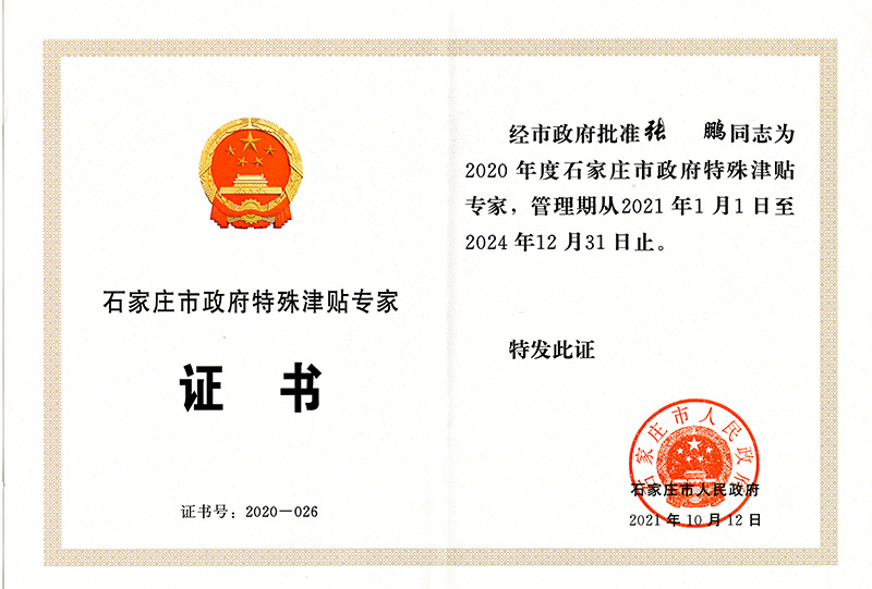 經(jīng)公司組織申報(bào),石家莊市人力資源和社會(huì)保障局組織評(píng)審,石家莊市人民政府批準(zhǔn),我公司張鵬同志榮獲石家莊市政府特殊津貼專家稱號(hào)。