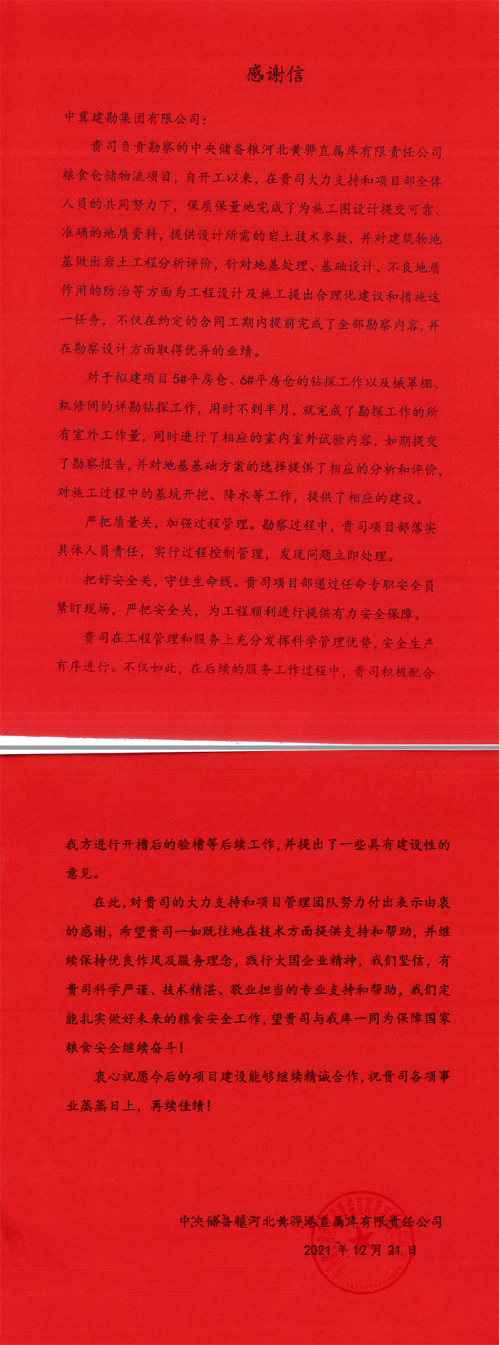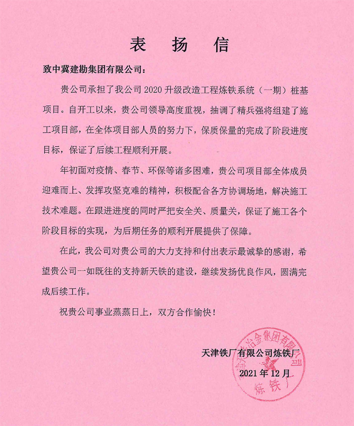 天津鐵廠有限公司煉鐵廠對我公司在疫情期間為確保項目目標(biāo)迎難而上、攻堅克難的精神表示贊賞,對我公司一如既往的支持和客戶至上的理念表示感謝。中儲糧河北黃驊直屬庫有限公司對我公司的勘察報告、后續(xù)驗收服務(wù)表示贊許,對公司提供的科學(xué)嚴(yán)謹(jǐn)、技術(shù)精湛、敬業(yè)擔(dān)當(dāng)?shù)膶I(yè)支持和幫助表示感謝。