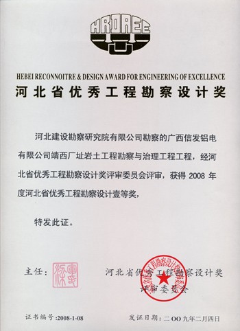 廣西信發(fā)鋁電有限公司靖西廠址巖土工程勘察與治理工程獲河北省優(yōu)秀工程勘察設(shè)計一等獎。