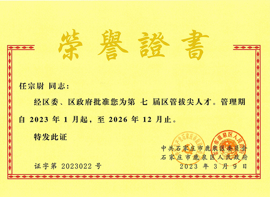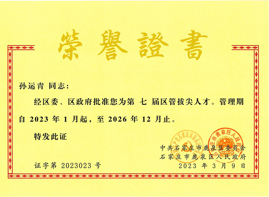 經(jīng)公司組織申報,中共石家莊市鹿泉區(qū)委員會組織資格審核、綜合評審、征求意見、實地考察、區(qū)委常委會議研究等程序,我公司孫運青、任宗尉兩名同志入選為石家莊市鹿泉區(qū)第七屆區(qū)管拔尖人才。