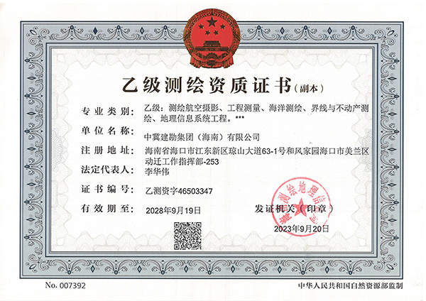 在集團(tuán)公司領(lǐng)導(dǎo)的正確領(lǐng)導(dǎo)下,經(jīng)過工程測量公司和安全生產(chǎn)部的精心運(yùn)作,中冀建勘集團(tuán)(海南)有限公司于2023年9月20日取得了海南測繪地理信息局頒發(fā)的測繪乙級資質(zhì),資質(zhì)包含五個(gè)專業(yè):測繪航空攝影、工程測量、海洋測繪、界線與不動產(chǎn)測繪、地理信息系統(tǒng)工程。