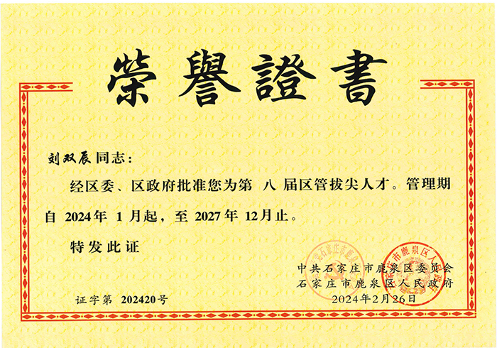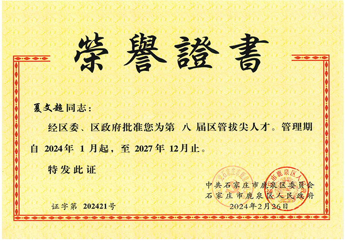 經(jīng)公司組織申報,中共石家莊市鹿泉區(qū)委員會組織資格審核、綜合評審、征求意見、實(shí)地考察、區(qū)委常委會議研究等程序,我公司夏文超、劉雙辰入選石家莊市鹿泉區(qū)第八屆拔尖人才。