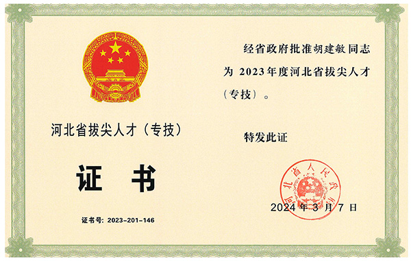 經(jīng)公司組織申報,石家莊市鹿泉區(qū)人民政府、石家莊市人民政府推薦,河北省人力資源和社會保障廳組織評審、答辯,河北省人民政府批準(zhǔn),公司胡建敏同志榮獲2023年度河北省拔尖人才(專技)。