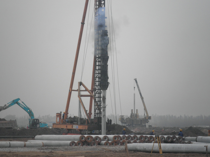 本工程我公司共完成樁徑Φ400mm、樁長18~27m的PHC管樁601根,共計約14976延米;樁徑Φ500mm、樁長23~32m的PHC管樁826根,共計約22039延米;樁徑Φ400mm、樁長15.6~21.6m的CFG樁537根,理論方量1360m3,實際方量為2029m3。