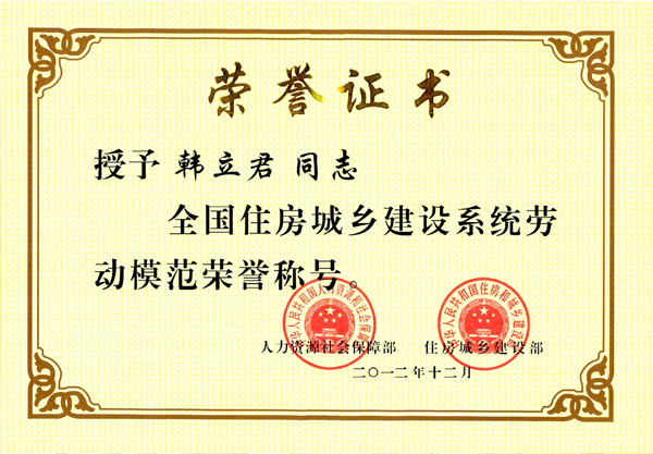為進(jìn)一步激勵(lì)全國(guó)住房城鄉(xiāng)建設(shè)系統(tǒng)廣大干部職工的積極性、主動(dòng)性、創(chuàng)造性,促進(jìn)住房城鄉(xiāng)建設(shè)事業(yè)健康持續(xù)發(fā)展,人力資源和社會(huì)保障部、住房和城鄉(xiāng)建設(shè)部在全國(guó)住房城鄉(xiāng)建設(shè)系統(tǒng)內(nèi),開(kāi)展了先進(jìn)集體和先進(jìn)個(gè)人的評(píng)選活動(dòng)。經(jīng)過(guò)公司及各級(jí)人力資源社會(huì)保障部門、住房城鄉(xiāng)建設(shè)管理部門的逐級(jí)推薦,報(bào)評(píng)選表彰工作領(lǐng)導(dǎo)小組審查通過(guò)后,最后由住房城鄉(xiāng)建設(shè)部黨組和人力資源社會(huì)保障部審定,評(píng)選出先進(jìn)集體200個(gè),先進(jìn)工作者450名,勞動(dòng)模范350名。其中,我公司董事長(zhǎng)韓立君同志榮獲全國(guó)住房城鄉(xiāng)建設(shè)系統(tǒng)勞動(dòng)模范稱號(hào)。