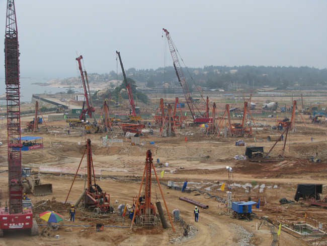 粵東液化天然氣項目由中海油投資建設,CB&I歐洲工程公司承攬三個儲罐的設計、施工、采購工作,受美國CB&I歐洲工程公司委托,我公司承接了三個罐區(qū)回填砂工作、樁基工程施工和檢測。自2013年3月7日開始施工,至2013年11月7日竣工,總計完成回填砂工作量約為7.2萬m3,混凝土灌注樁1074根。
